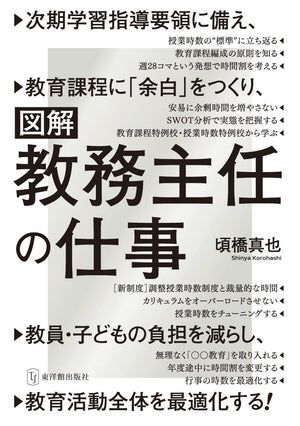 「教育主任に求められる役割」「教育課程を編成するとはどういうことか」といった基礎・基本、「カリキュラムをオーバーロードさせない」「余剰時間を最低限に抑える」「年度の途中で授業時数を調整する」「特例校制度を利用せずに授業時間を短縮する」といった応用に加え、「調整授業時数制度」「裁量的な時間」「学習内容の学年区分の弾力化」「週28コマの発想で『余白』をつくる」など、次期学習指導要領改訂に係る新しい提言・制度への対応方法までまとめています。